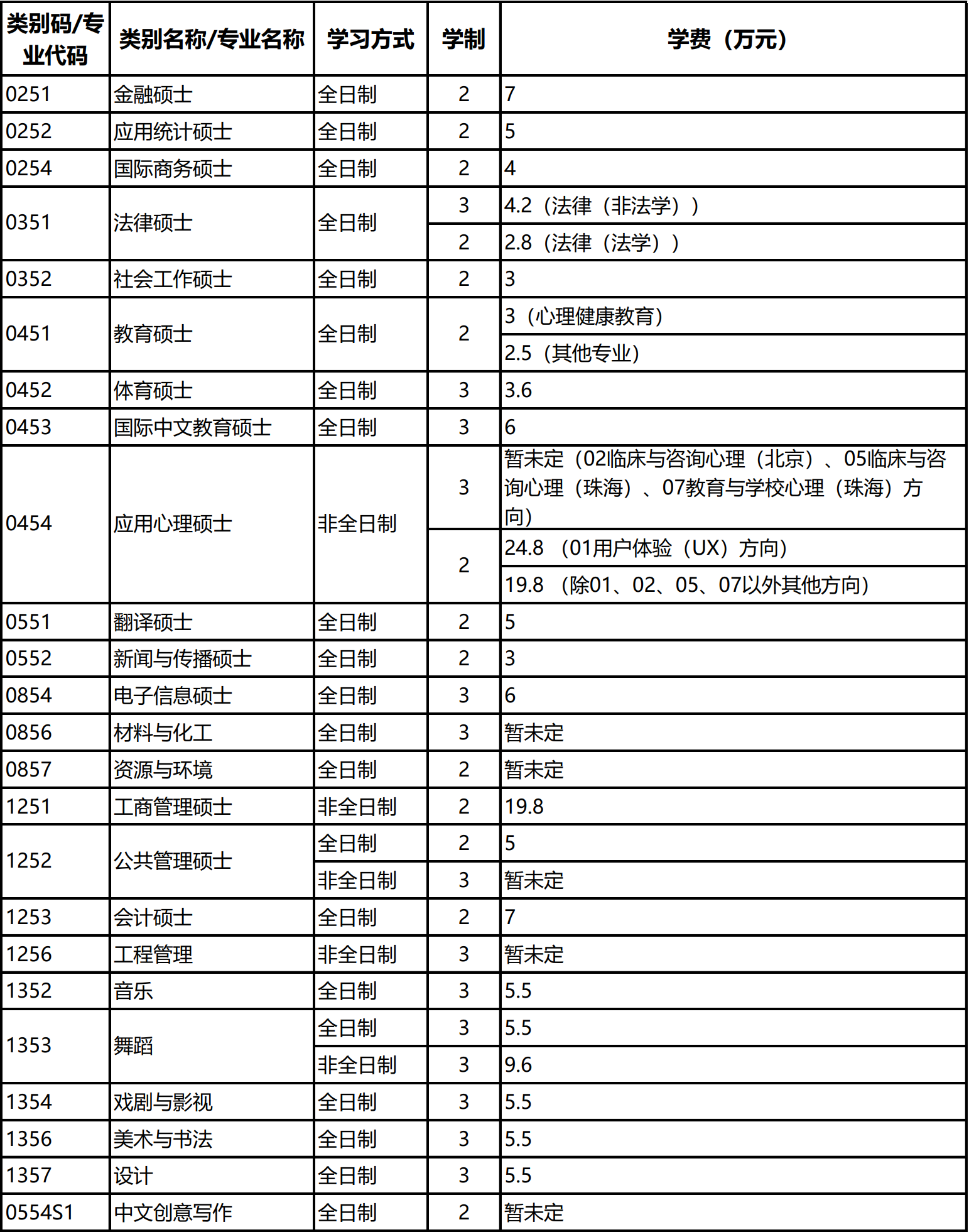 北京师范大学2026年专业学位硕士学习方式、学制学费一览表